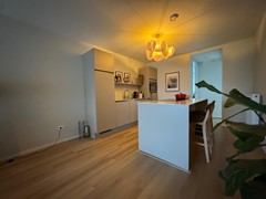 Je komt de woning binnen in een hal en daarna loop je door naar de woonkamer. Aan de voorzijde bevindt zich een knusse zithoek en aan de achterzijde een open keuken met een kookeiland. De keuken is voorzien van een vaatwasser, koelkast met vriezer, inductie kookplaat en combimagnetron.