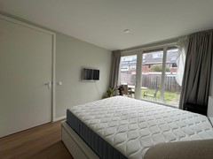 Aan de achterzijde zitten twee slaapkamers. Beide hebben toegang tot de tuin.
