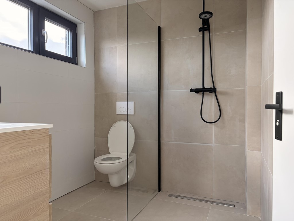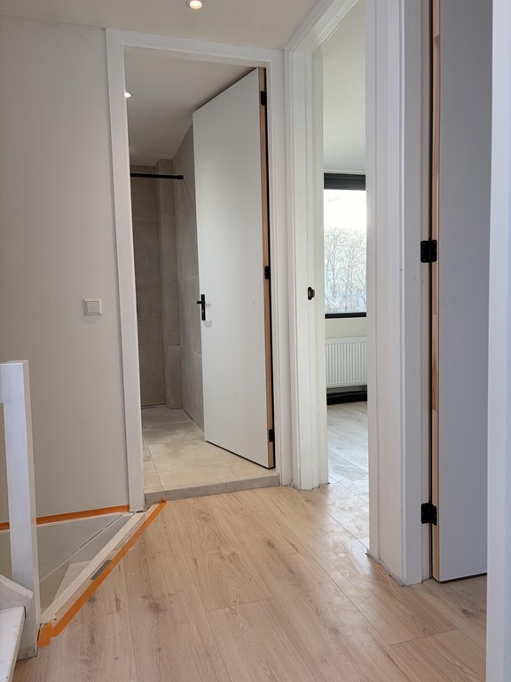 Overloop, moderne badkamer met douche en toilet, en toegang tot 3 slaapkamers.