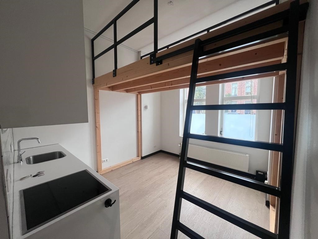 Deze prachtig volledig gerenoveerde en hoogwaardig afgewerkte studio gelegen op de begane grond is volledig zelfstandig. De studio is gelegen aan de voorzijde van het pand. De woonkamer is voorzien van een moderne open keuken, uitgerust met een koelkast, vaatwasser, kookplaat en afzuigkap Daarnaast heeft de woonruimte een eigen badkamer met douche, wastafel en toilet. Op verschillende plekken in het pand staan wasmachines, die beschikbaar zijn voor gezamenlijk gebruik.