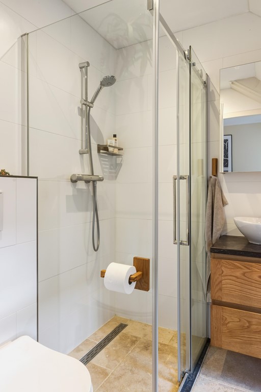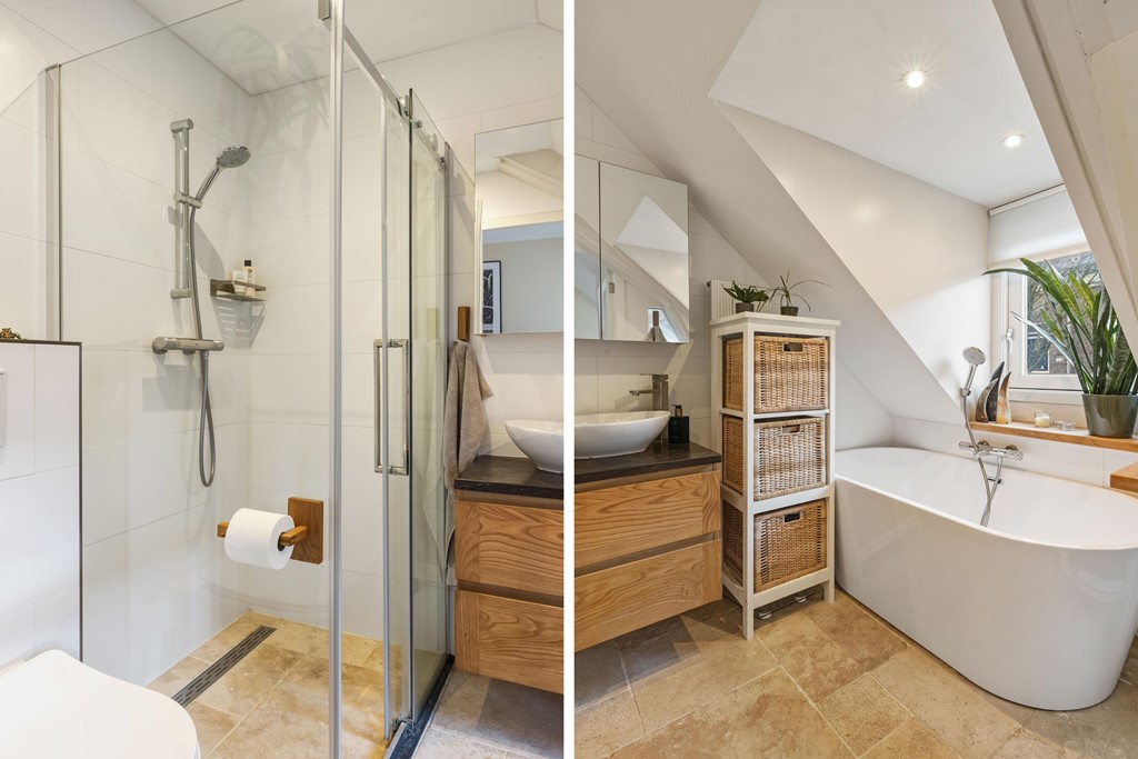 De moderne badkamer is voorzien van een ligbad, douche, wastafelmeubel en toilet.
