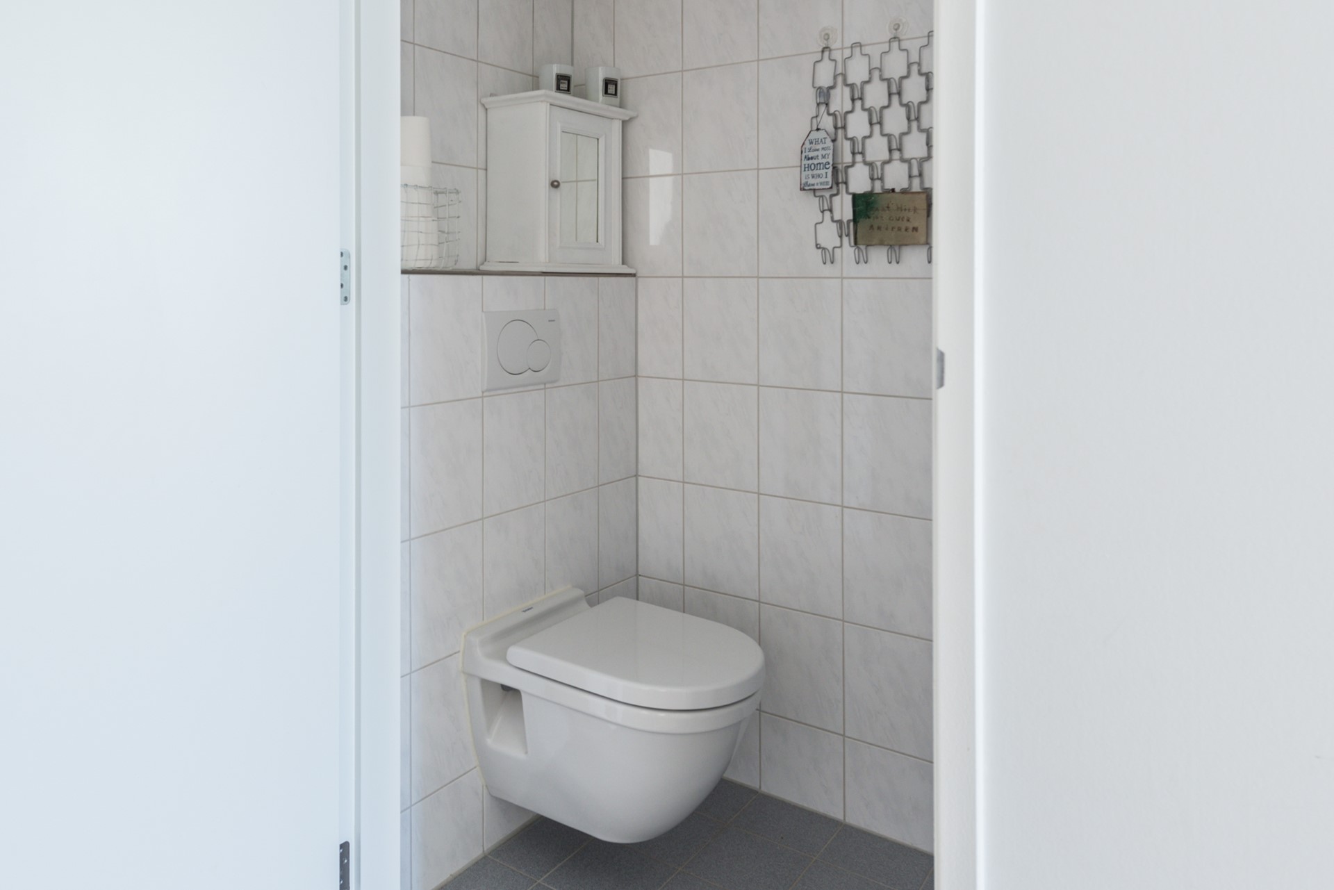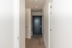 Entree appartement, ruime hal met toegang tot alle vertrekken, meterkast, berging met opstelplaats voor de wasmachine en wasdroger, separate, volledig betegeld toilet met hangend toilet en fontein en een handige berging/provisiekast.