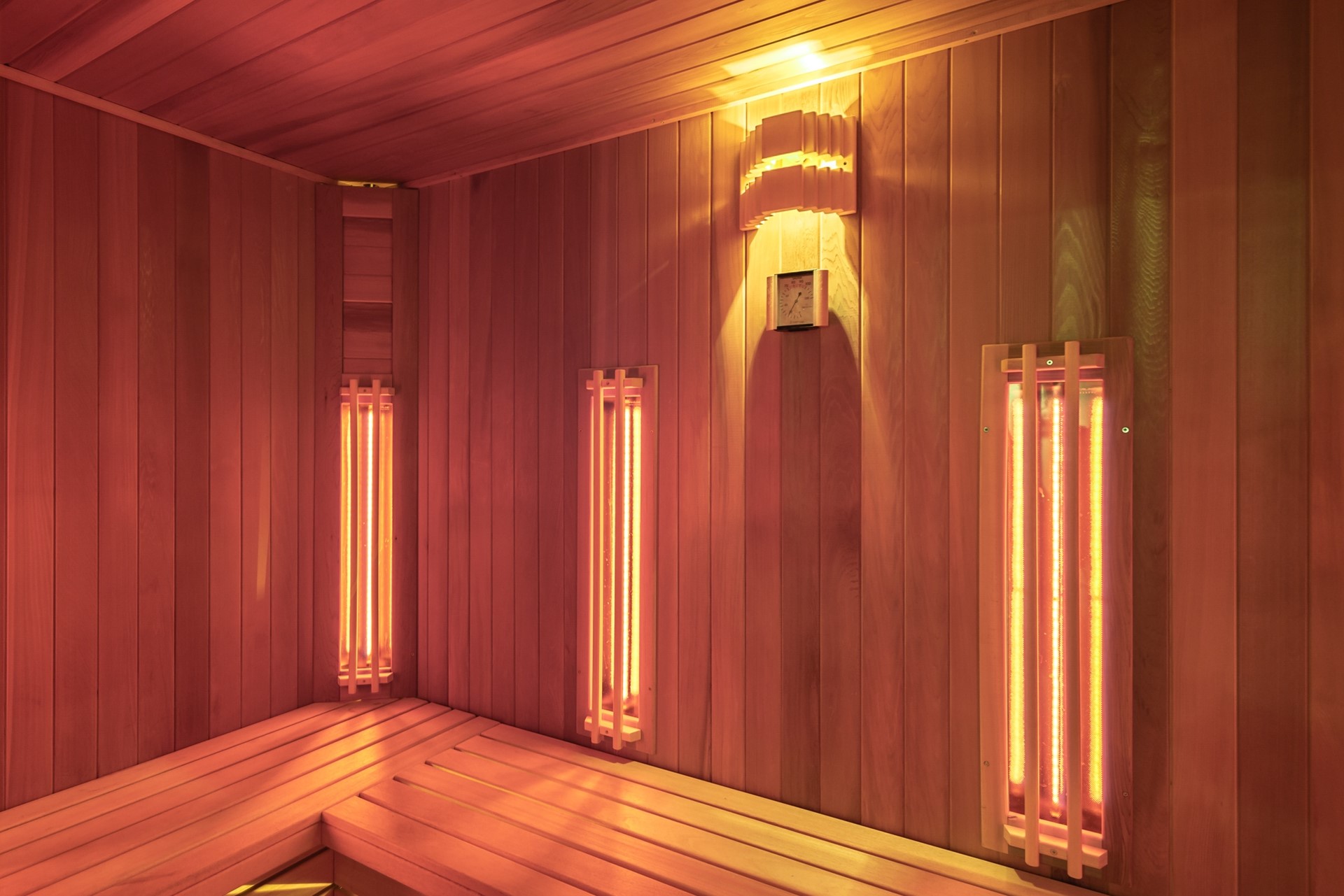 Professionele fitnessruimte, 24/7 toegankelijk, met infrarood sauna exclusief voor bewoners.