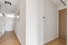 Entree, hal, toilet met fontein, toegang tot de ruime en lichte woonkamer voorzien van fraai afgewerkte wanden, mooie vloer en een open keuken voorzien van apparatuur te weten, 4 pits inductie kookplaats, afzuigkap, magnetron, koel/vriescombinatie, vaatwasser en een spoelbak. De schuifpui in de woonkamer biedt toegang tot het zonnig balkon op het zuiden.
