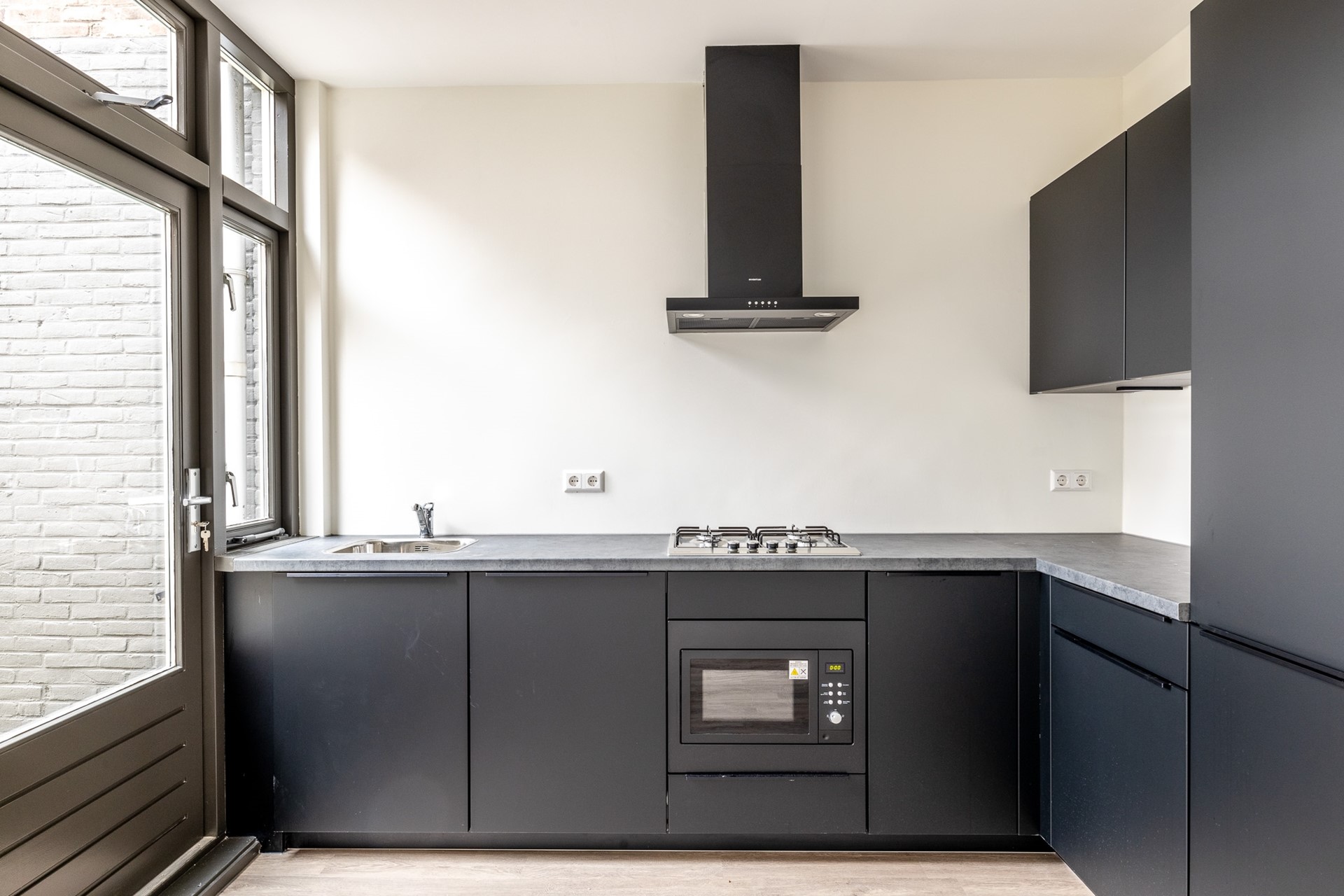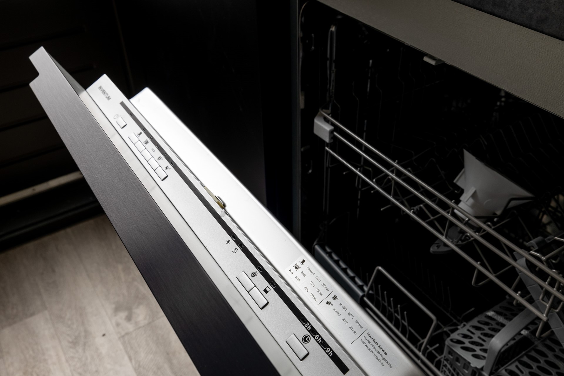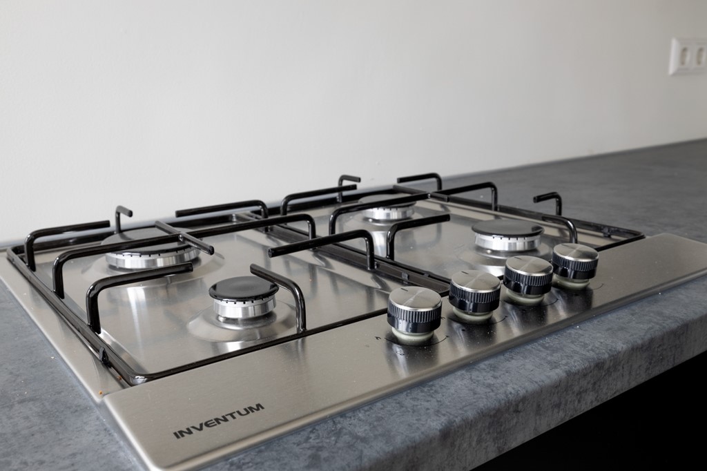 Aan de achterzijde bevindt zich de moderne keuken, uitgerust met diverse inbouwapparatuur, waaronder een 4-pits kookplaat, afzuigkap, koelkast met vriesvak en vaatwasser.