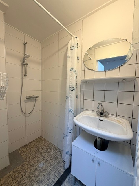 Achter de woonkamer zit een eveneens grote kamer van ca. 32m². In deze kamer bevindt zich ook de badkamer die voorzien is van een douche en een wastafel.