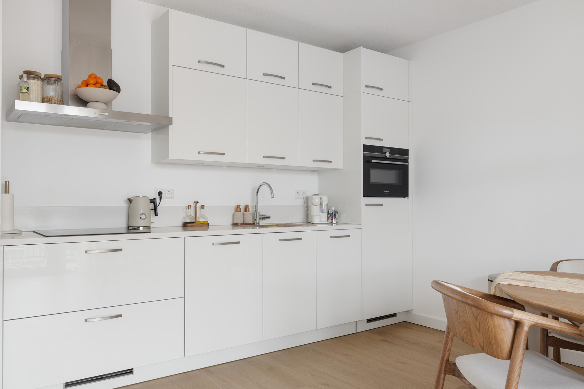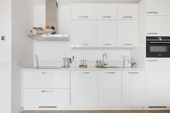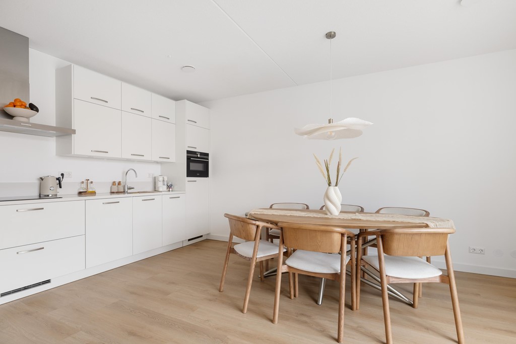 Aan het einde van de hal is er toegang tot de woonkamer met keuken. De mooie afwerking springt direct in het oog! De keuken is voorzien van alle wenselijke inbouwapparatuur waaronder een koel-/ vriescombinatie, combi-/ oven magnetron, inductiekookplaat met afzuigkap en vaatwasser. Er is veel opbergruimte in de keuken. De woonkamer grenst aan het ruime balkon, gelegen op het oosten. Dit is met recht een prachtig instap klaar appartement te noemen! Het gehele appartement is voorzien van vloerverwarming.
