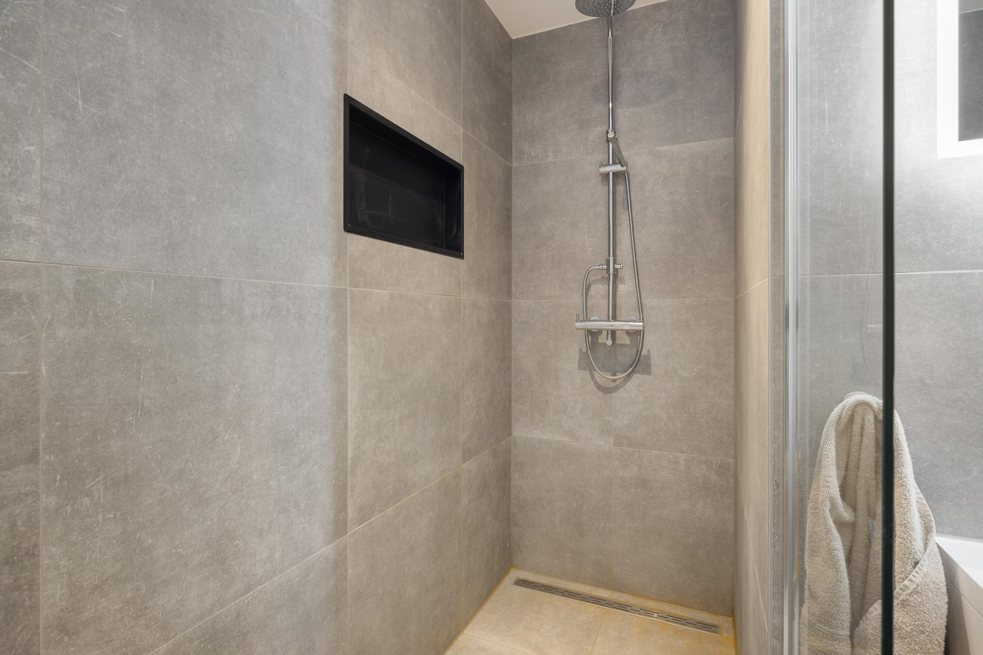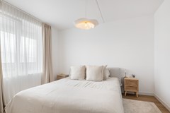 Bij binnenkomst kom je in een ruime hal die toegang geeft tot de verschillende vertrekken van het appartement. Het appartement beschikt over twee ruime slaapkamers en een moderne badkamer, uitgerust met een ruime inloopdouche, een modern wastafelmeubel met dubbele wastafel en een designradiator. In de hal bevind zich een grote inpandige berging waar de opstelling voor de warmtepomp staat. Hier kunnen ook de wasmachine en droger geplaatst worden.