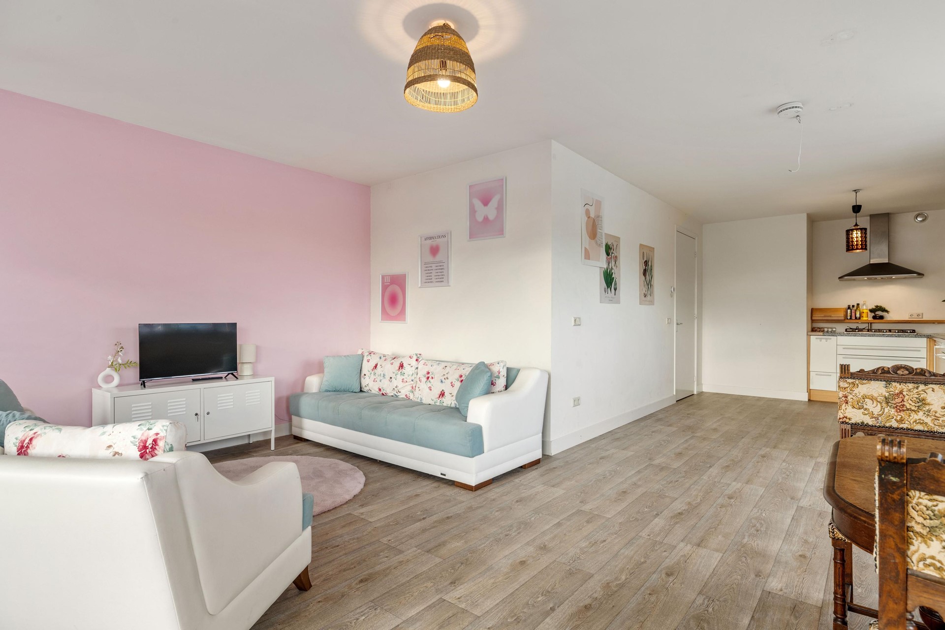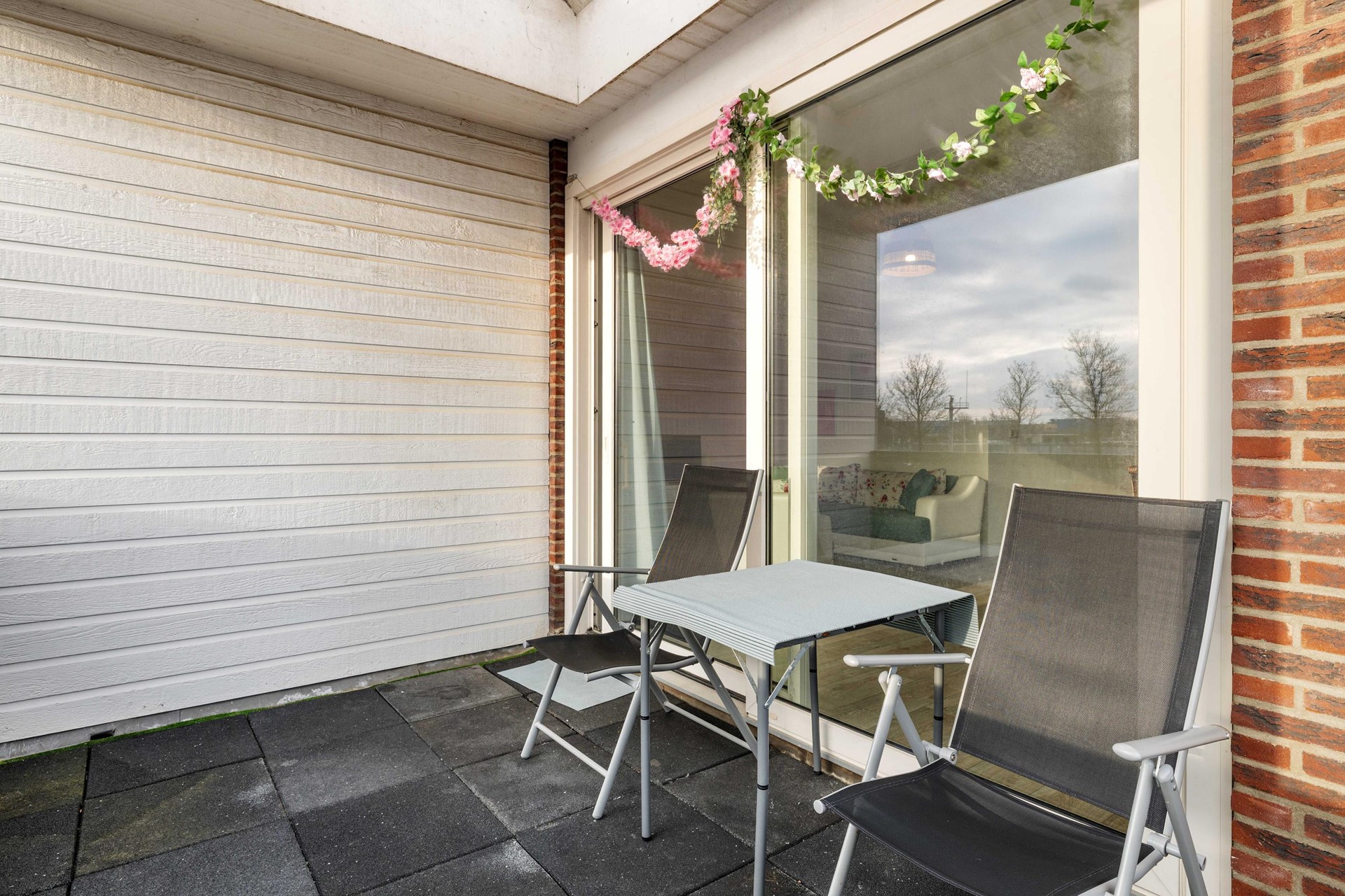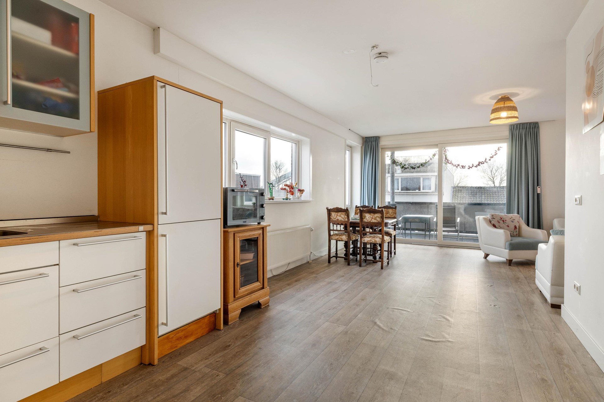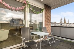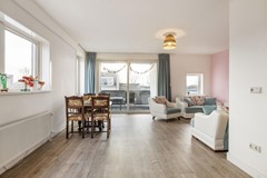 Vanuit de woonkamer geeft een schuifpui toegang tot het zonnige dakterras van ca. 12 m² gelegen op het zuidwesten. Door de hoekligging komt er veel natuurlijk licht binnen, waardoor de woonkamer een aangename leefruimte is.