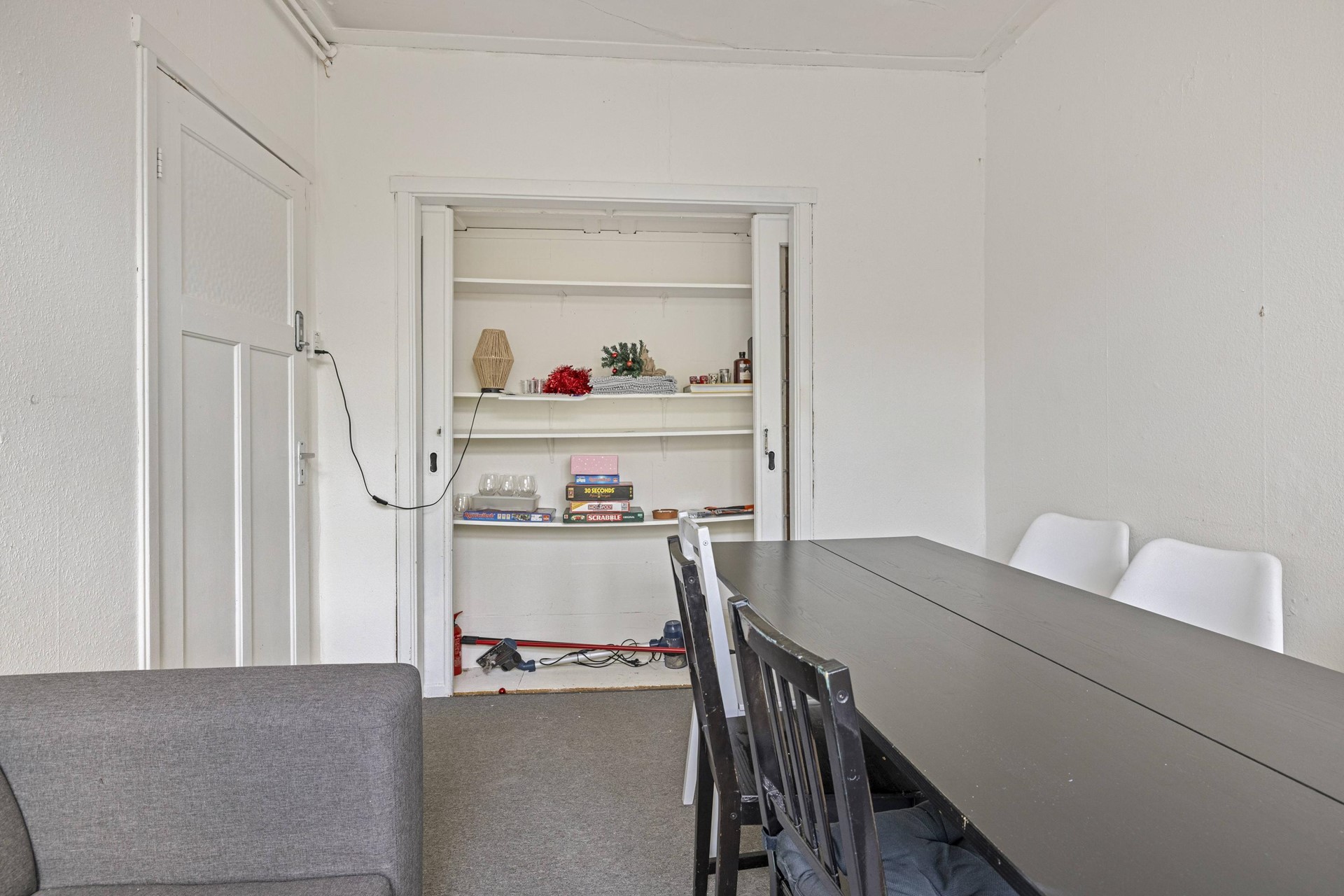 Via de hal bereik je het toilet, de keuken en de woonkamer. De woonkamer bevindt zich aan de voorzijde, met aan de achterzijde een voormalige kamer-en-suite die momenteel in gebruik is als eetkamer. De openslaande deuren zorgen voor een prettige lichtinval en geven toegang tot het balkon. De (gesloten) keuken is toegankelijk vanaf de overloop, eenvoudig uitgevoerd, maar functioneel.