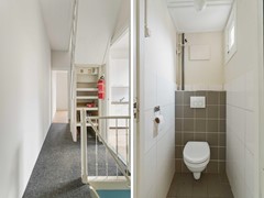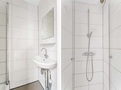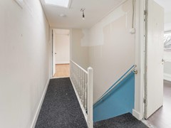Bovenaan de trap kom je uit op een overloop. Vanuit daar bevindt zich aan de rechterkant de keuken met aansluitend de badkamer. De keuken is voorzien van een eenvoudig keukenblok en opstelplaats voor de wasmachine. De badkamer is voorzien van een douche en een wastafel.