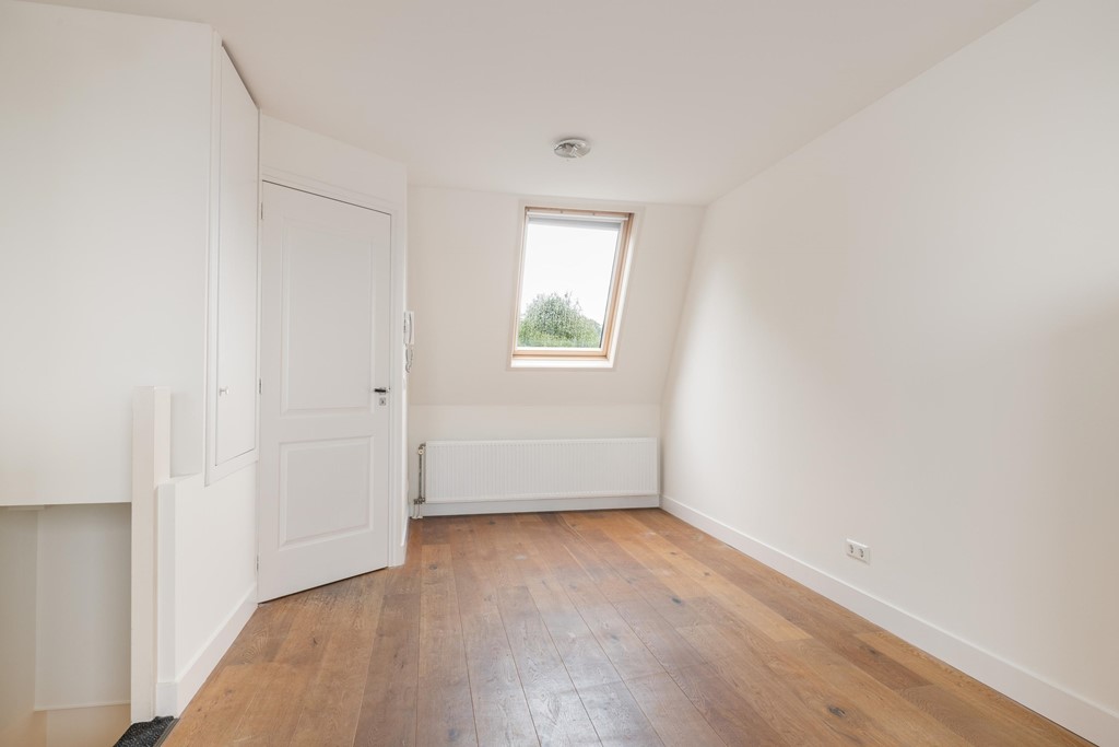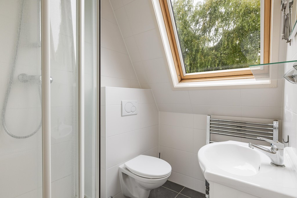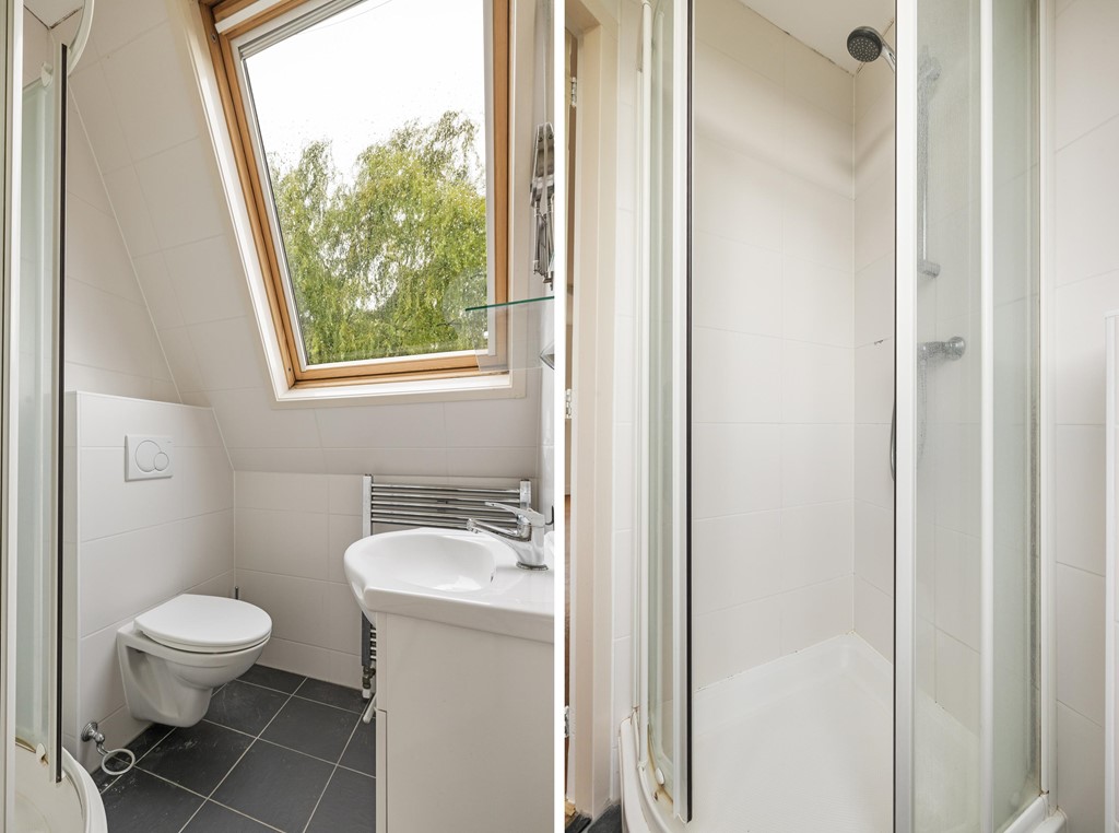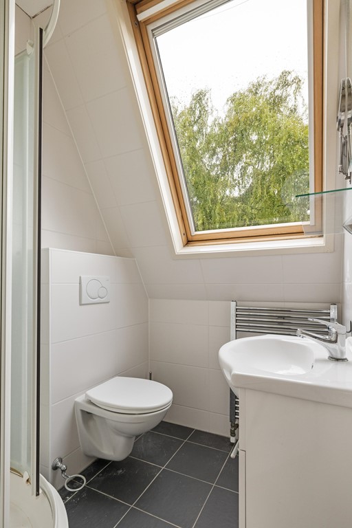 De badkamer is volledig betegeld en beschikt over een douchecabine, toilet, wastafel én een groot dakraam voor natuurlijk daglicht. Naast de badkamer bevindt zich een aparte ruimte met aansluitingen voor wasmachine en cv-installatie.