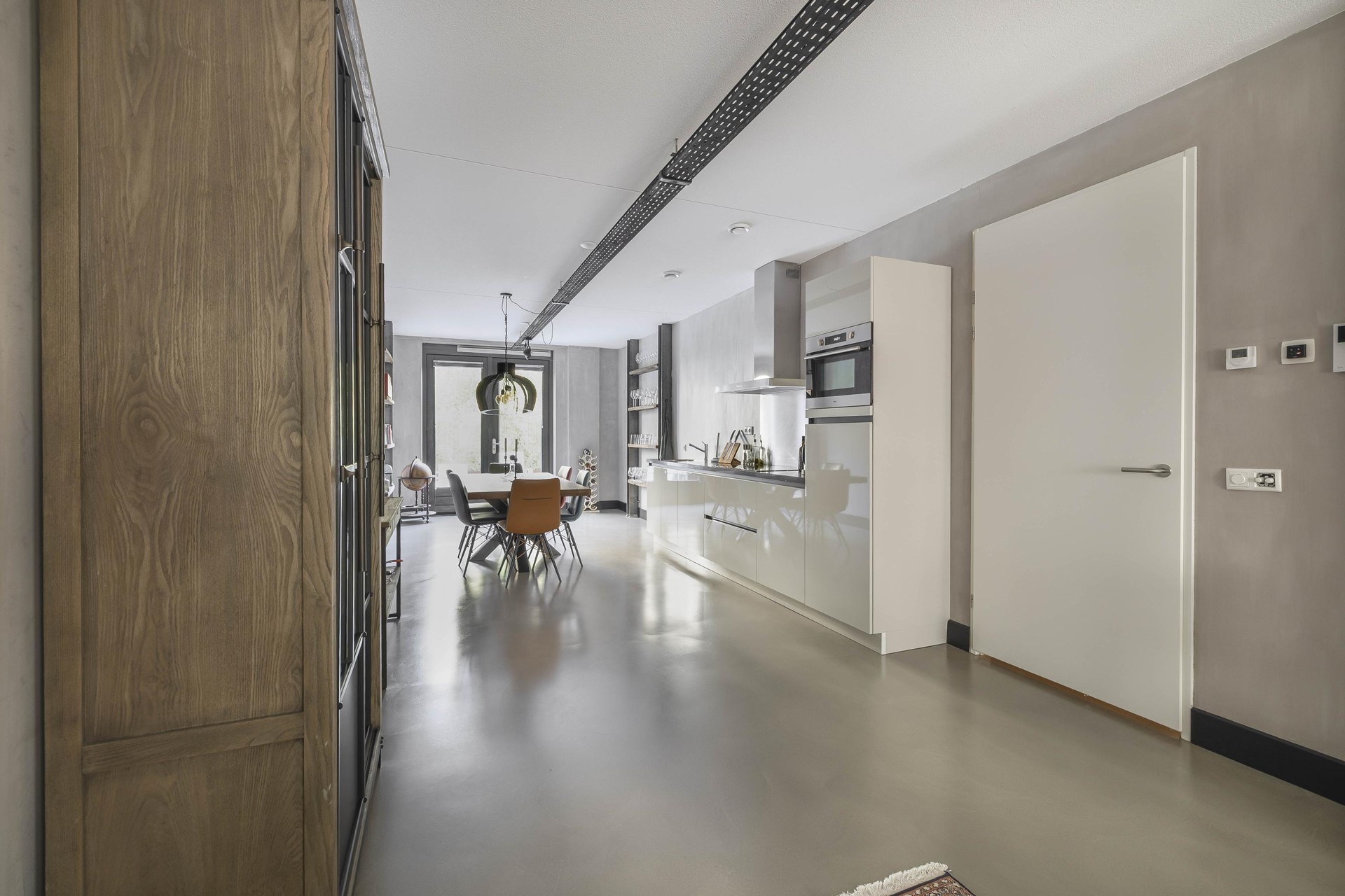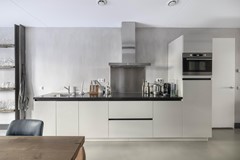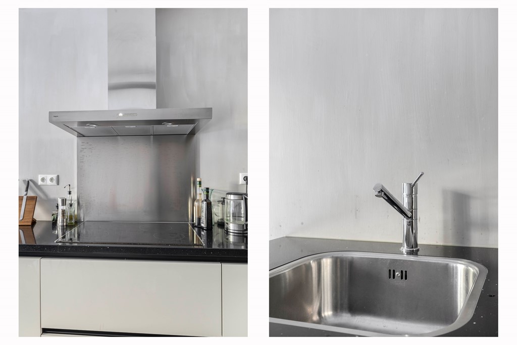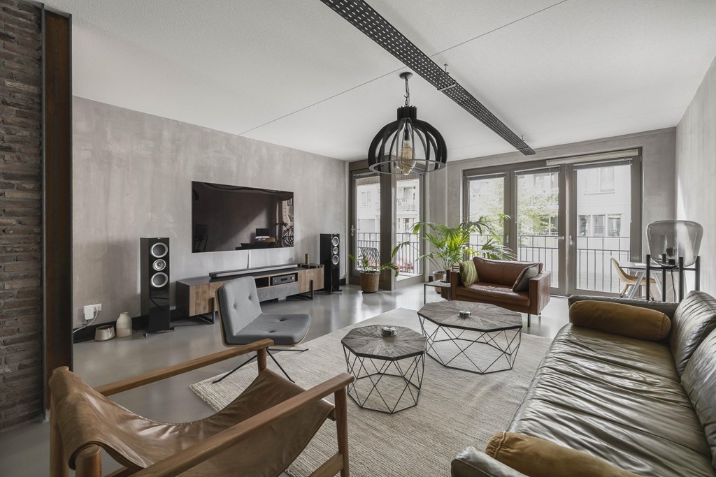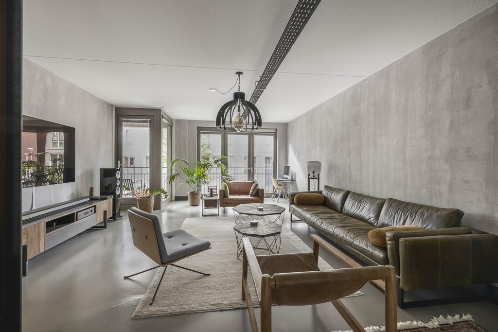 De gehele woning is voorzien van een moderne gietvloer in betonlook. Er zijn industriële details aangebracht in de woonkamer zoals metalen U staanders met daar tussen gemetselde muren. De moderne keuken is voorzien van inbouwapparatuur en biedt ruimte voor een grote eettafel, perfect voor gezellige diners met vrienden. Vanuit de keuken is het terras van ca. 30m² aan de achterzijde van het appartement bereikbaar. Een heerlijk ruim terras met uitzicht op de fraai aangelegde binnentuin van het complex.