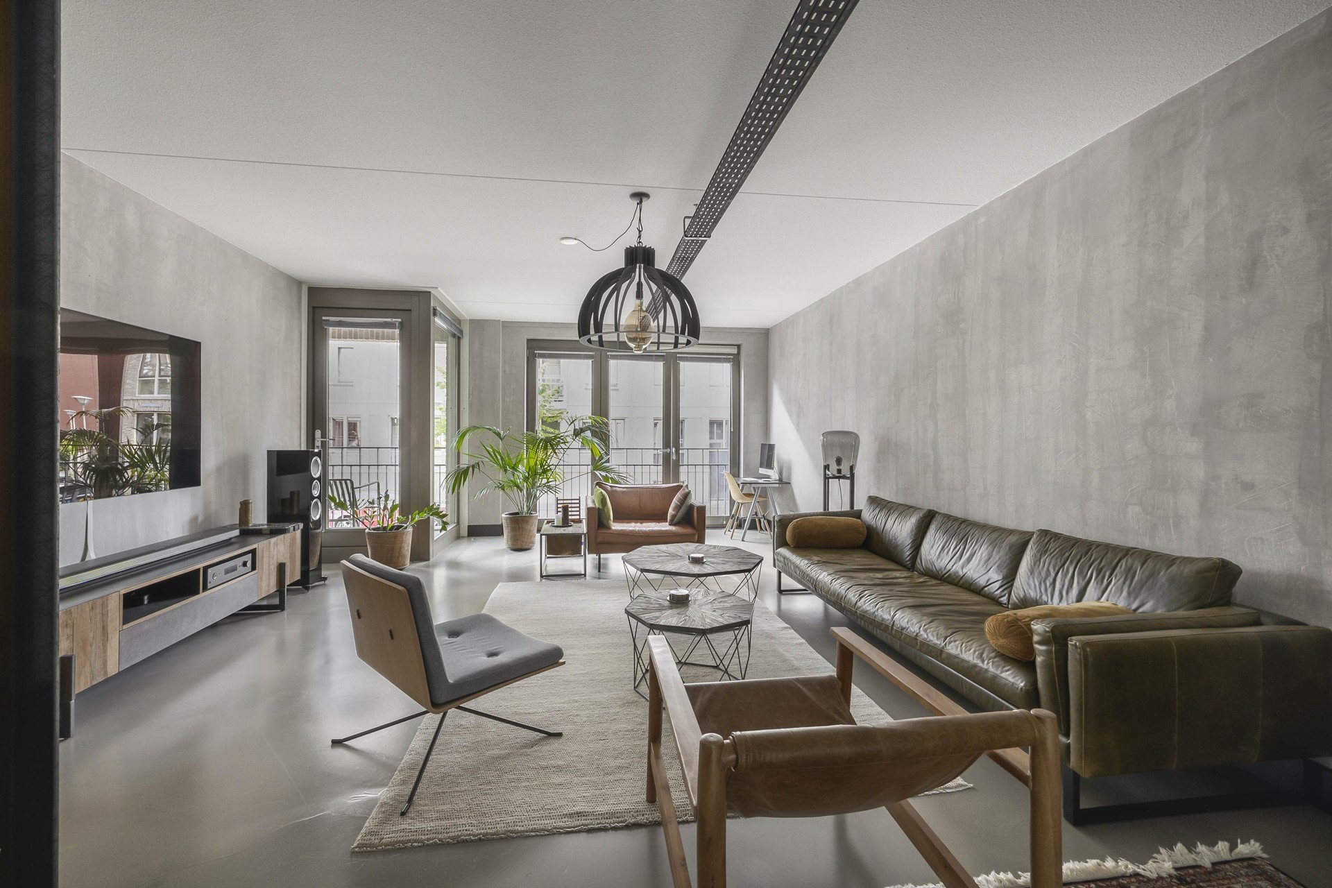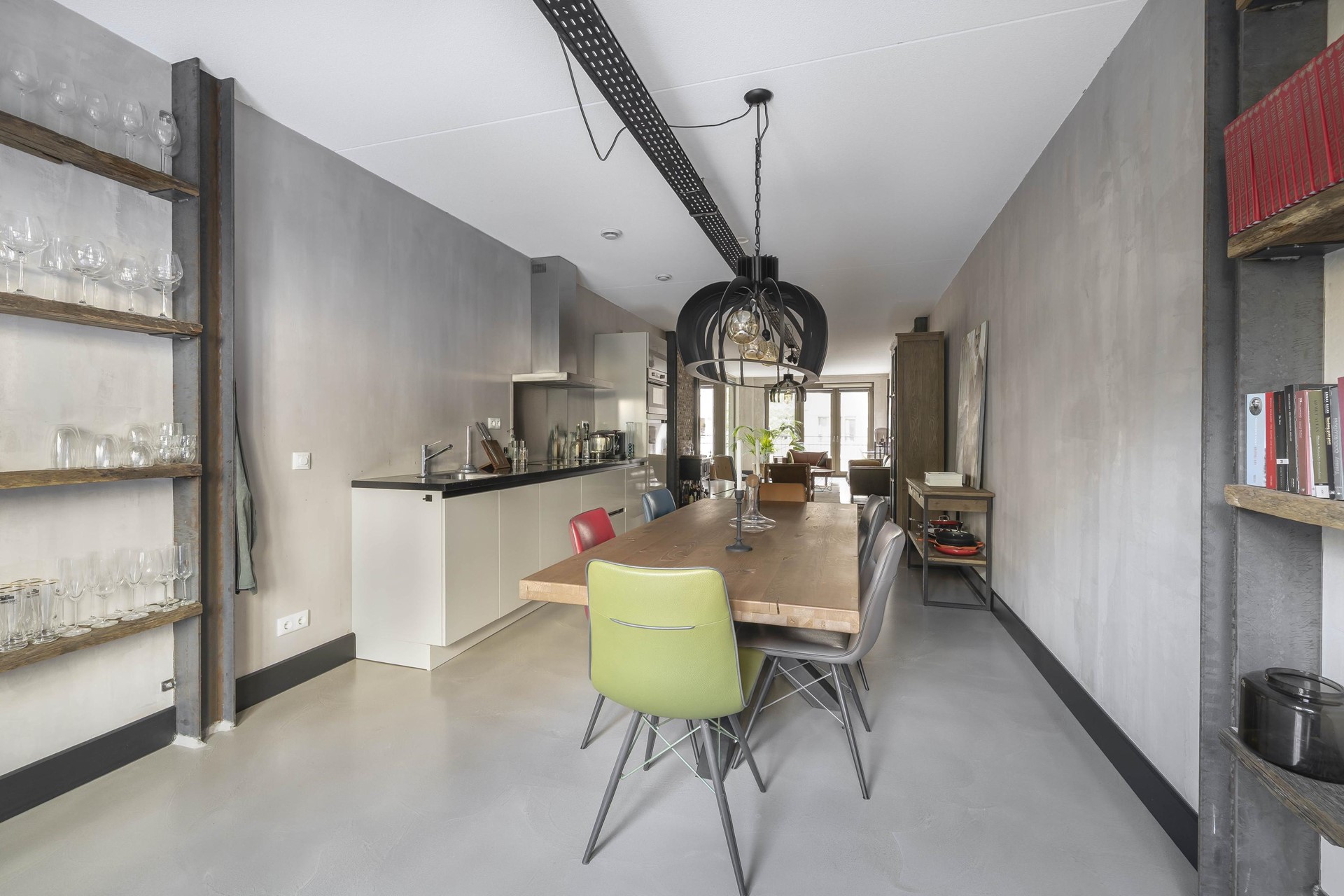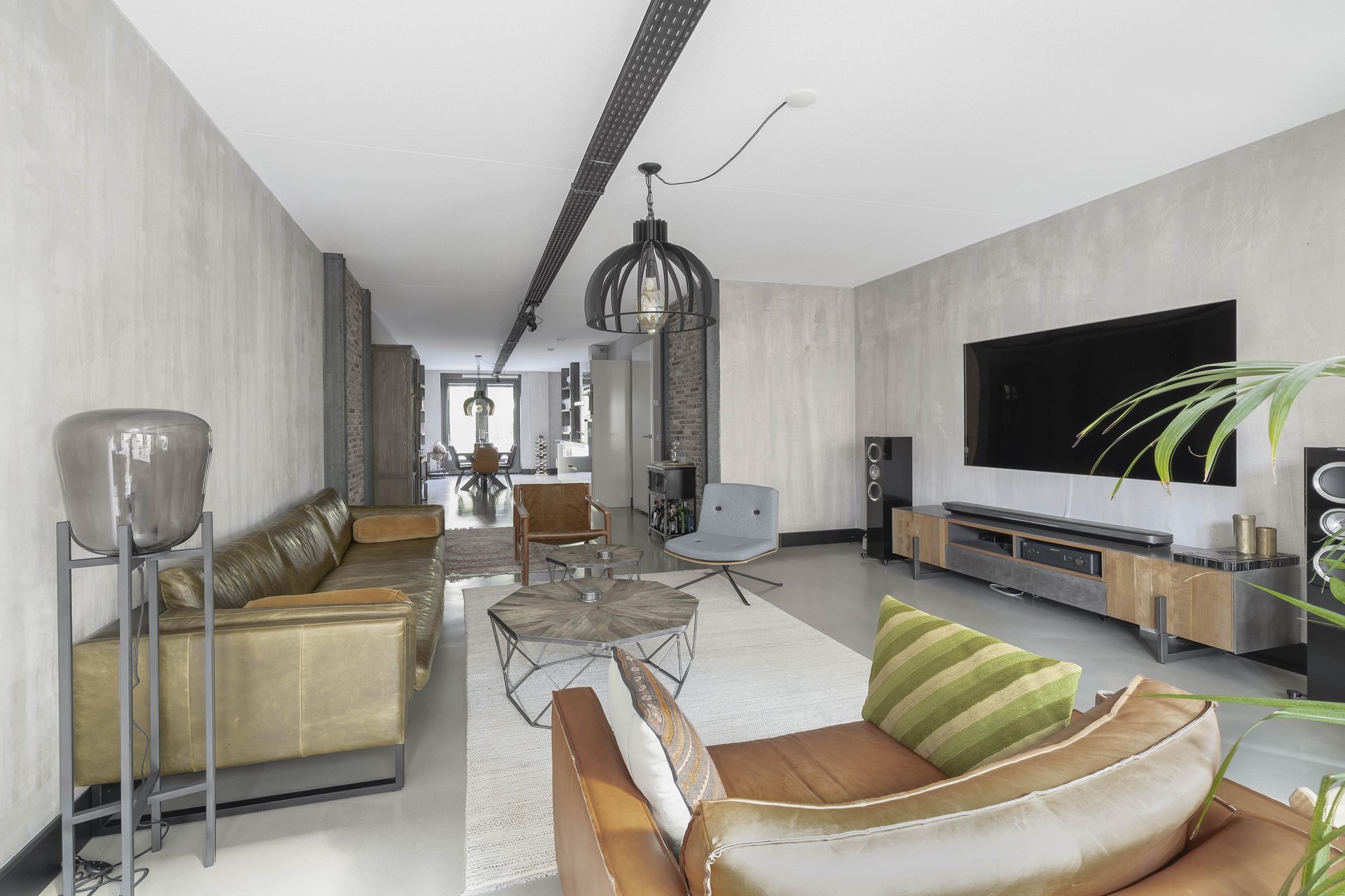 De gehele woning is voorzien van een moderne gietvloer in betonlook. Er zijn industriële details aangebracht in de woonkamer zoals metalen U staanders met daar tussen gemetselde muren. De moderne keuken is voorzien van inbouwapparatuur en biedt ruimte voor een grote eettafel, perfect voor gezellige diners met vrienden. Vanuit de keuken is het terras van ca. 30m² aan de achterzijde van het appartement bereikbaar. Een heerlijk ruim terras met uitzicht op de fraai aangelegde binnentuin van het complex.