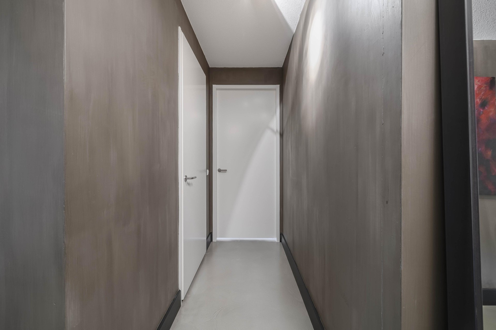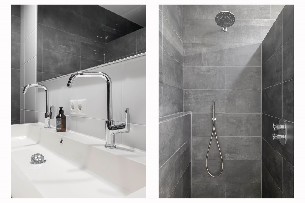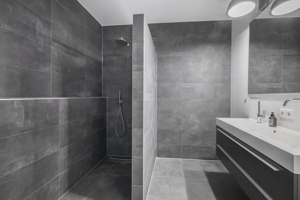 De moderne badkamer is stijlvol afgewerkt met grijze betonlooktegels en voorzien van een inloopdouche en een dubbel wastafelmeubel. Bovendien is de badkamer uitgerust met vloerverwarming voor extra comfort.