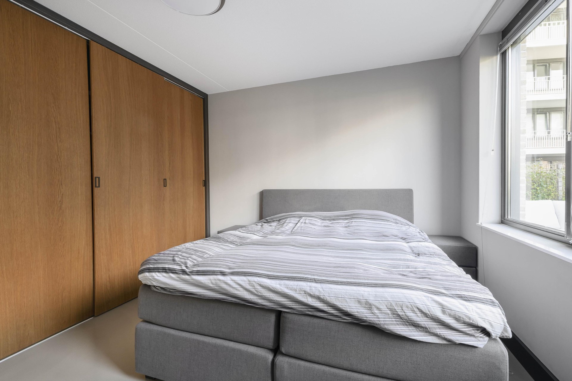 Er zijn twee ruime slaapkamers, waaronder een royale slaapkamer met op maat gemaakte vaste kasten. Deze kamer bevindt zich aan de achterzijde van het appartement, waardoor u kunt genieten van optimale rust en privacy. De tweede slaapkamer ligt aan de voorzijde en biedt directe toegang tot de loggia, ideaal als extra slaap-, werk- of hobbykamer.